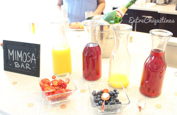 Además de la mesa de dulces, también decoramos otra mesa para la comida salada. Hicimos un “brunch” y hasta tuvimos un Bar de Mimosas para las invitadas. Los cubiertos y platos son de color gold rose. Sobre el mantel blanco colocamos confetti también rose gold y peach.