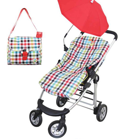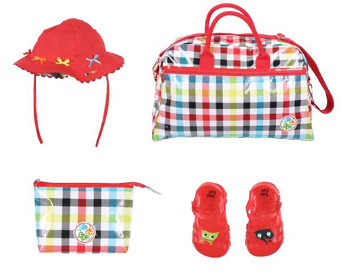 La colchoneta de verano para la silla de paseo, las bolsas y bolsos de maternidad plastificados con estampado de cuadros, así como los complementos de moda infantil que os mostramos, pertenecen a la colección Plankton de tuc tuc.