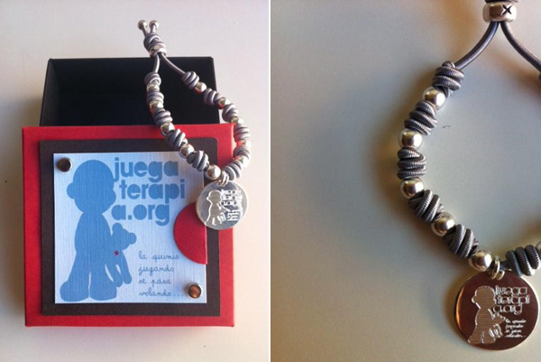 Juegaterapia es una ONG que se encarga de recoger consolas y videojuegos para donarlo a hospitales con zona de oncología infantil, para hacer que el tiempo de espera y de quimioterapia pase lo más rápido posible. Carittas Jewelry se ha sumado a esta labor solidaria donando un 15% de cada pulsera vendida. La pulsera está confeccionada con un cordón azul grisáceo (el color de la ONG), del que cuelga una medalla en la que pueden verse el nombre y el logo de Juegaterapia, cuyo lema es ‘La quimio jugando se pasa volando’.